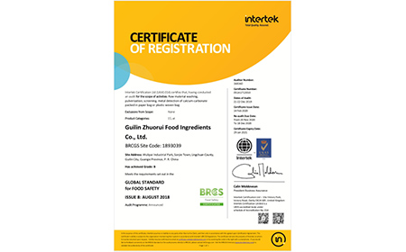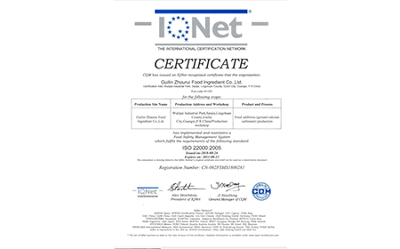 建立健全各项规范管理制度,严格进行品质控制,已通过ISO9001国际质量管理体系认证和ISO22000食品安全管理体系认证、犹太Kosher认证、BRC食品安全全球标准审核、国家工业与信息化部“诚信管理体系认证”等,是专业的食品级钙盐生产企业。